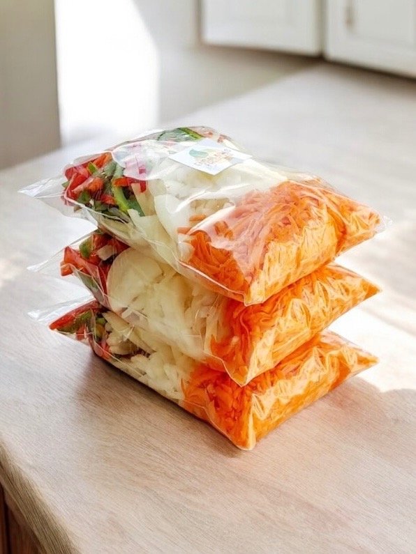 Combinación de vegetales frescos y listos para usar: cebolla en juliana, pimiento en juliana y zanahoria rallada.